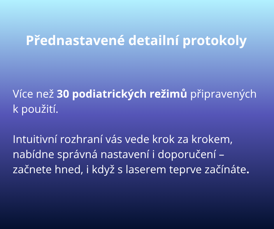 Cesta ke zdravým chodidlům začíná světlem. Zažijte laserové ošetření, které rychle tlumí bolest, zánět i otok, aktivuje hojení a přitom je neinvazivní a bezbolestné. Přesně cílené vlnové délky, vyšší komfort, lepší výsledky.